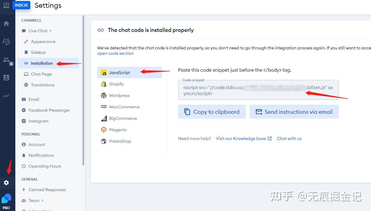 注册成功后,登陆Tidio后台,进入Setting界面,找到installation,点击JavaScript,可以看到一段代码。